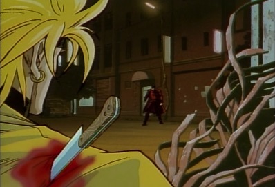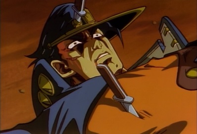 Dio says it's over, but here's one more, just to be certain! He throws a knife which Star Platinum tries to punch, but it bounces off his arm and hits Jotaro's head. |