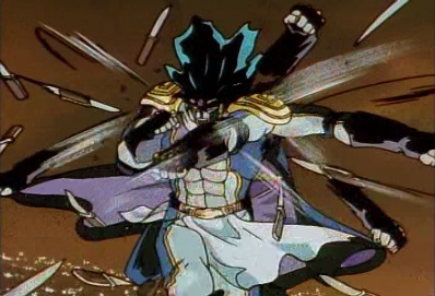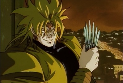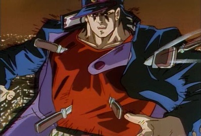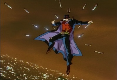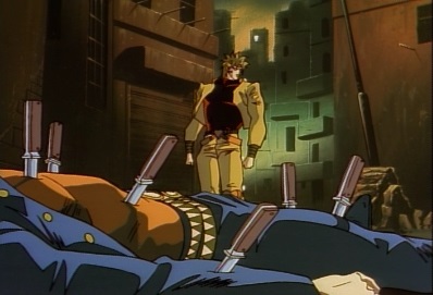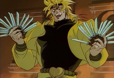 He jumps up onto the roof of a building, and asks Jotaro has he intends to avoid these knives. He throws a set of them out, and they stop just before Jotaro. Dio thinks the fact Jotaro can still see these must make it even more frightening. |