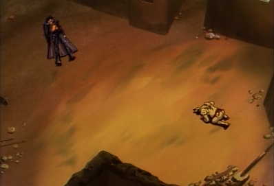 Dio thinks how dare Jotaro insult him. But even in the most crucial moment, Jotaro is still human. His way of thinking is meant for someone who will only live for a short period of time. He thinks what Jotaro just said about leaving a bad taste will be a fatal mistake. He starts to get back up and says that for him, there is only one simple ideal: victory and conquest. The method for how he gets his ideal doesn't matter! |