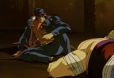 He's still alive, thanks to the splints he'd stuffed down his shirt earlier blocking the knives. He's more annoyed that Dio dared to put holes through his prized school jacket. He thinks he's still taken some heavy damage, so he'll just have to try playing dead and waiting for his chance. If Dio were to throw knives again, he doesn't think he'll be able to dodge them all this time. He needs to find a way to deliver a direct blow to Dio's head. Dio then drops down, and wonders if Jotaro is dead. But then he thinks he can't be too cautious when dealing with the Joestar bloodline. This is the first time for him, Dio, to feel a tinge of fear. He thinks he shouldn't go near Jotaro carelessly, as he might be playing dead. |