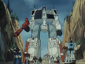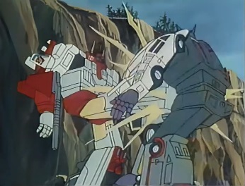 The Buildrons unite and transform into Devastor. But Ultra Magnus sends out the Airbots, who shoot down Devastor. Starscream and the other Destrons retreat, infuriating Megatron. Megatron decides to send in the Stuntrons instead. The Stuntrons arrive and engage the Airbots, but the Airbots reveal they can unite, and form the super robot, Superion! However the Stuntrons can also transform, and they merge into their own super robot form: Menasor. The two super robots start fighting, and both use "scramble power" -where their limbs can pop off and reattach in different configurations. |
