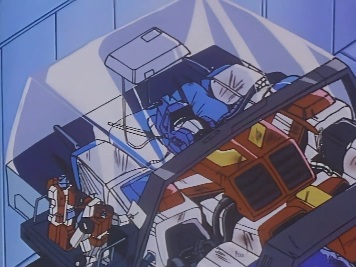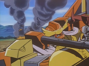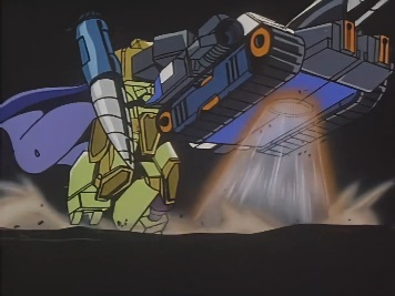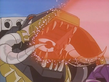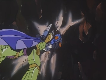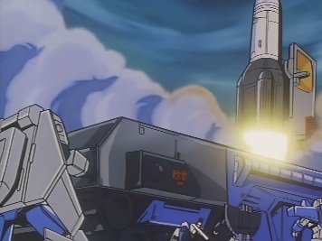 The Cybertrons continue firing, but start to realize they can't stop the Destrons. As the rocket shakes, Cain tells Akira it's alright, the Cybertrons will protect them -he knows it. But outside, Dinosaurer is about to clobber the rocket. |