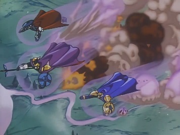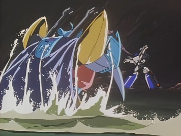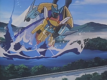 Meanwhile, King Poseidon returns to the surface, as does Dai Atlas. Sonic Bomber starts shooting at King Poseidon, forcing him to drop the zodiac. |