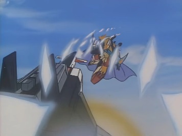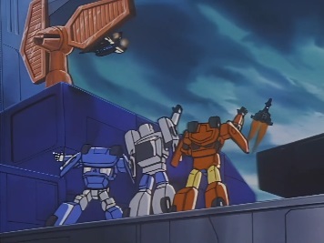 ...which smashes through a building. As the Cybertrons fire back, the Jet Patrol Team transform and take off. |