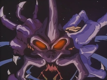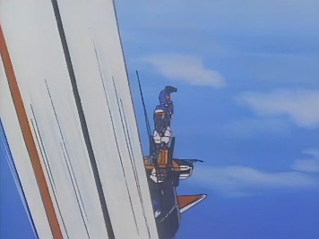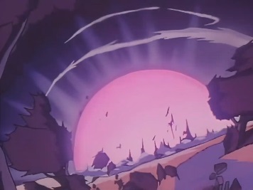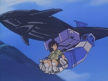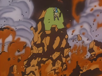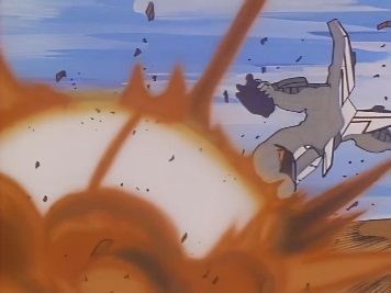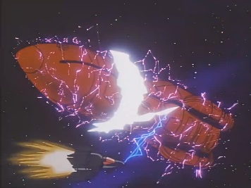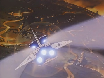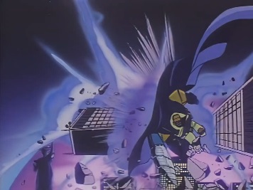 ...which he throws down into the planet, shattering part of it. Cain has to hang on as the ground around him rips apart, but help is at hand Victory Saber, Galaxy Shuttle and the Rescue Patrol Team arrive. |