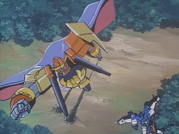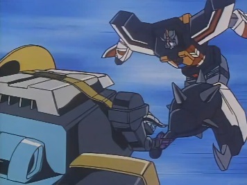 Dai Atlas fires on Predaking, but Predaking tells him the likes of him and his guns have no effect on their armor! Predaking then attacks Dai Atlas with a sword. Meanwhile, Sonic Bomber transformers and rams into Dinosaurer, knocking him down. |