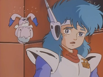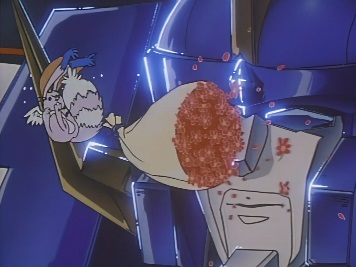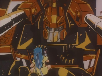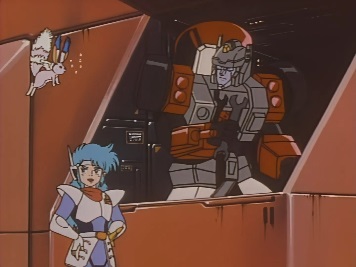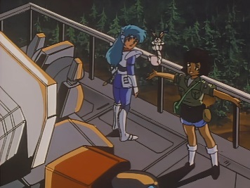 As Moonradar repairs a cannon, Emusa says that Zone doesn't even have a single flower. Cain says it's because Zone is super science planet. Emusa wonders if it makes Moonradar and the others lonely, but Moonradar says he wouldn't say that. Emusa exclaims that he's not a mechanism, he's a living creature made of flesh and blood, and he wants to see flowers and nature from time to time! Moonradar says his kind are also living: they are super robot life forms. Cain tells Emusa not to say such things. |