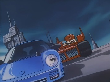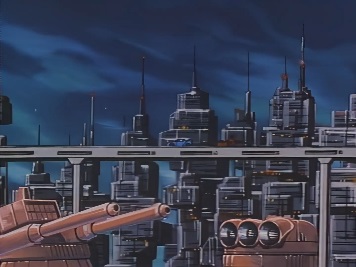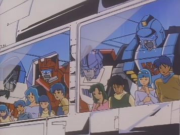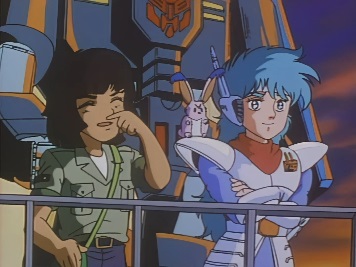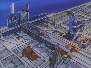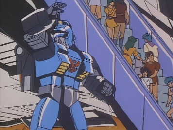 Moonradar is out for a drive with Cain and Emusa. He asks Cain how life is on this planet, and Cain says it's the best. Rabbicrater drives in front of them and asks if that's so. He says that Zone has a super energy called energon Z, which is used for the largest Cybertron space self-defense system. Cain says Moonradar had mentioned that Zone was built by the Powered Masters, and Moonradar says that's right. The Powered Masters are space pioneers, heroes of their race since they support civilization and progress, and fight to build an ideal peaceful paradise in the galaxy. The group then arrive at: |