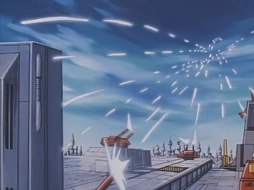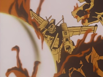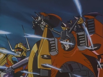 All the weapons open fire, as the Destrons move in. Menasor says to kill them all, and throws out a projectile... |