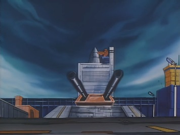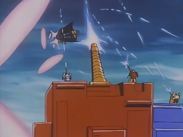 Moonradar is informed that more Destrons have been located, so he orders everyone to move out and hit the Destrons with everything they've got. He has the rocket land and transform, which becomes a battle base. The Cybertrons fire on the Destrons, but again, their attacks can't do any damage. The Destrons start returning fire. |
