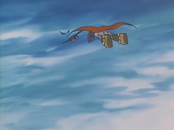 Devastor tells Dai Atlas that he'll split his back open like a wind tunnel. Dai Atlas remembers that they're 15,000 meters underground, and scans something above him. He transforms and takes off, dragging Devastor with him. |