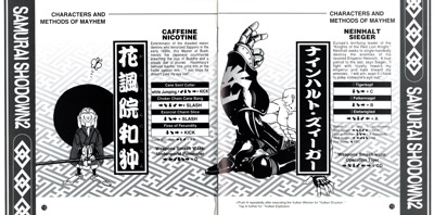 All of the names under the life bars have a different front, which looks identical to the font used in the first game. The final version changed the font completely. The spine card screenshot has Nicotine's name as "Jiji", which was most likely just a placeholder name -see this prototype footage page for more details. Genjuro's name is also spelt "Genjurou". |