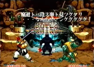 | "Genjurou" was shortened to just "Genjuro" in the final game. Also of note is that in the video, Kuroko hold his red flag in his right hand, and his white flag in his left hand. The flags were swapped around in the final game. As was also seen in the intro, Genjuro's palette is red in places in the video, the red parts were changed to pink for the final game. |