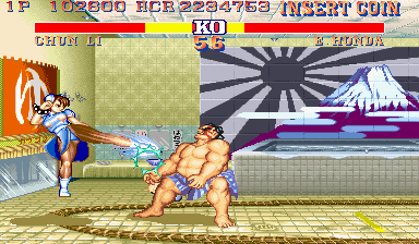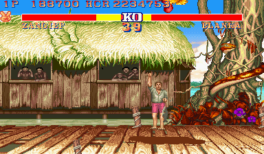 Dhalsim's drill attacks are funny in this game, at least when playing against the CPU. Dhalsim will charge towards the edge of the screen and get stuck there, whilst the CPU will often not do anything and the time will run out. But Dhalsim will keep spinning and the game won't go to the next round, meaning it will need to be reset. |